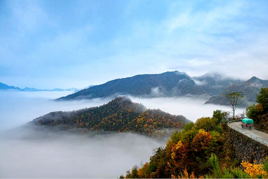 城口縣地處重慶最北端、大巴山腹心地帶、南北氣候過渡帶,森林覆蓋率居全市第一,擁有近4000種植被。大巴山由于海拔高,氣候、植被存在明顯的立體差異,每到深秋時節(jié),近4000種植物競相抹色,爭奇斗艷,整個大巴山呈現(xiàn)出赤橙黃綠青藍紫一幅幅層林盡染般的山水景色。加之,城口不少大山海拔在2000米以上,秋冬時分極易看到云海。此時,霧海與彩山交相輝映,波瀾壯闊、浪漫多情,讓人不禁發(fā)出感嘆:此景只應(yīng)天上有,人間難得幾回見。