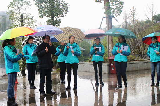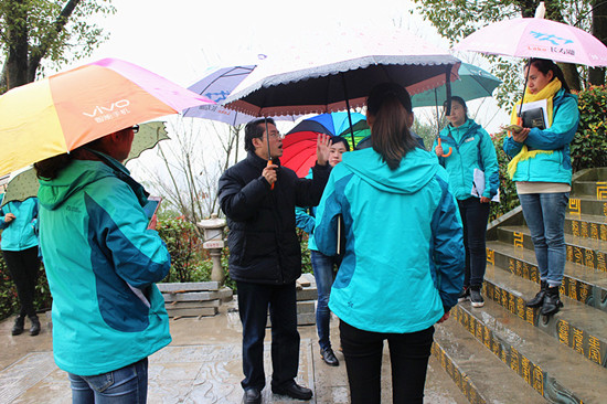 12月15日,院長李永明一行到長壽區(qū)菩提山風景區(qū),對景區(qū)導游進行《中華長壽寶典導游詞》的專題培訓。當天氣溫驟降,李院長帶領(lǐng)十多名導游,冒雨迎風,從山腳景區(qū)大門起步一路拾級而上直達山頂,用兩個多小時時間,比照一個個景點及相關(guān)導游詞,考察導游們對導游詞熟悉領(lǐng)會、把握講解情況,并多次模擬示范,深入淺出講解,并根據(jù)景點實際添加新鮮內(nèi)容。導游們學習非常用心,一致評價李院長的導游詞寫得有文采,講得更生動,她們熟悉導游詞的過程不僅僅是為了工作,更是學習中華文明、了解重慶和長壽地脈文脈與歷史人文、豐富知識和人生的寶貴機會。