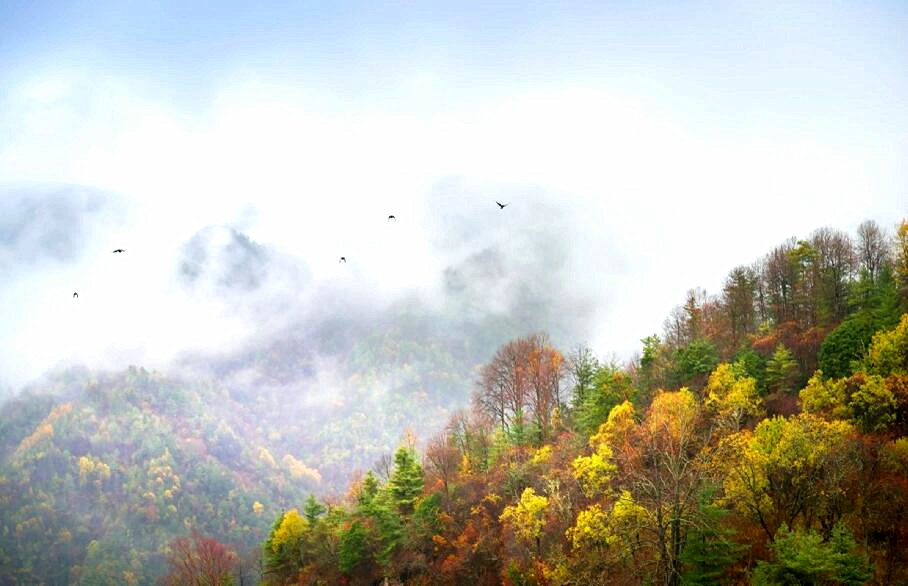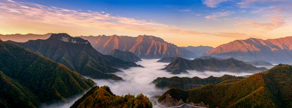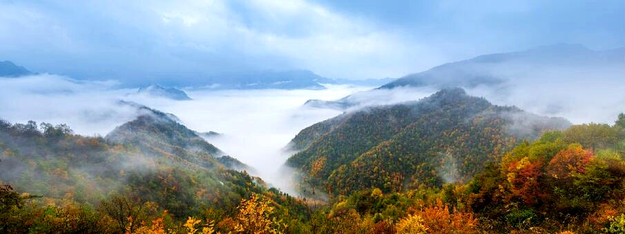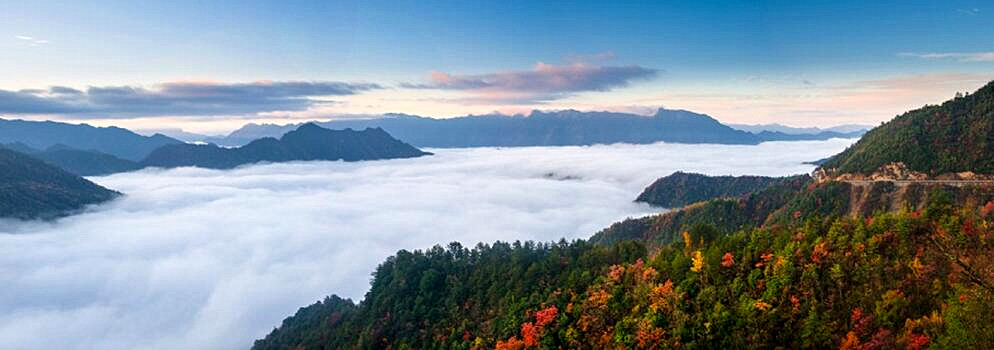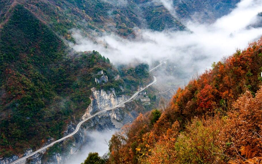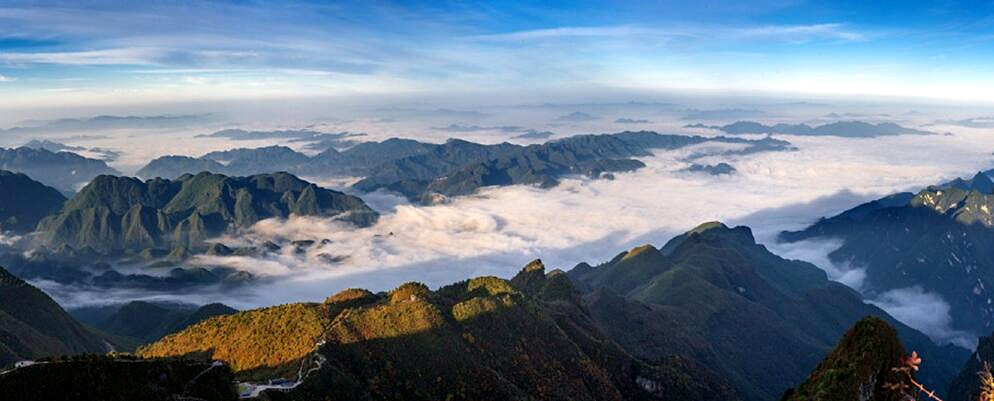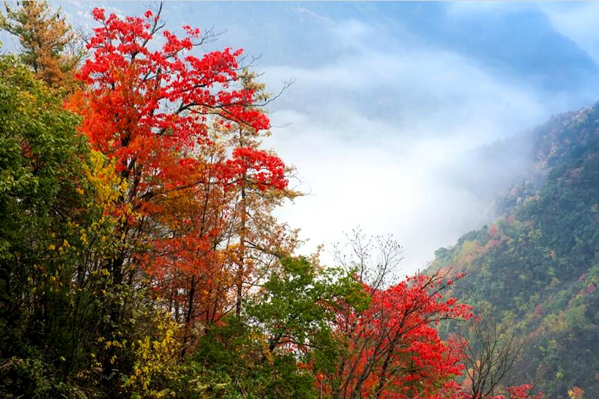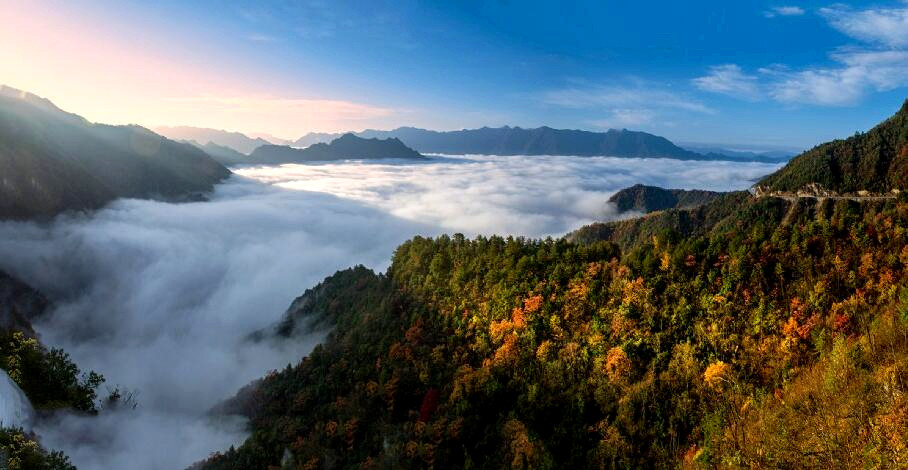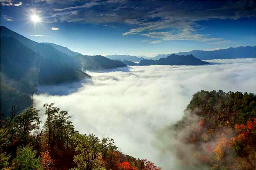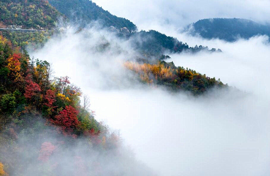 城口縣地處重慶最北端、大巴山腹心地帶、南北氣候過渡帶,森林覆蓋率居全市第一,擁有近4000種植被。大巴山由于海拔高,氣候、植被存在明顯的立體差異,每到深秋時節(jié),近4000種植物競相抹色,爭奇斗艷,整個大巴山呈現(xiàn)出赤橙黃綠青藍紫一幅幅層林盡染般的山水景色。加之,城口不少大山海拔在2000米以上,秋冬時分極易看到云海。此時,霧海與彩山交相輝映,波瀾壯闊、浪漫多情,讓人不禁發(fā)出感嘆:此景只應(yīng)天上有,人間難得幾回見。