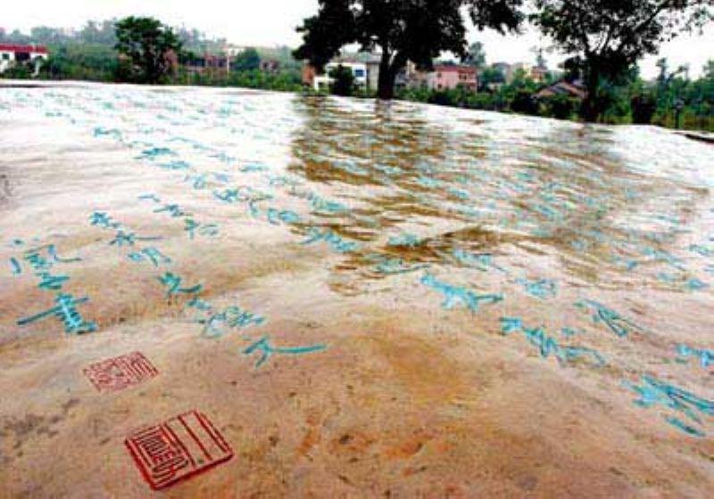 據(jù)書寫該賦的我市知名書法家、本報(bào)編輯張弢介紹,當(dāng)時(shí)把這賦轉(zhuǎn)移到巨石上頗費(fèi)了些周折,“是書法與現(xiàn)代科技的結(jié)合!”書寫后先掃描到電腦里放大,然后制作出一張500多平方米的大紙,鋪在巨石上。接著,將字體部分挖空,用刷特制漆涂在上面,最后風(fēng)干后揭開紙,于是,巨大的文字便成功“印”在了巨石上。這項(xiàng)工程動(dòng)用了20名工匠,耗時(shí)整整兩個(gè)月才完成!