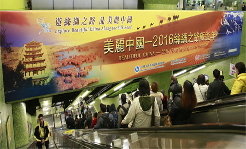 1月26日,一幅長14.5米、高2.5米,面積達(dá)36平方米,以“美麗中國—2016絲綢之路旅游年”為主題的大型廣告在香港灣仔地鐵站閃亮登場。大漠、駝隊(duì)、雪山、海洋等元素配以黃沙和藍(lán)海底色,組合成一幅絲路風(fēng)景的寫意圖畫,形成了強(qiáng)大的視覺沖擊力,吸引了過往乘客拍照留念。